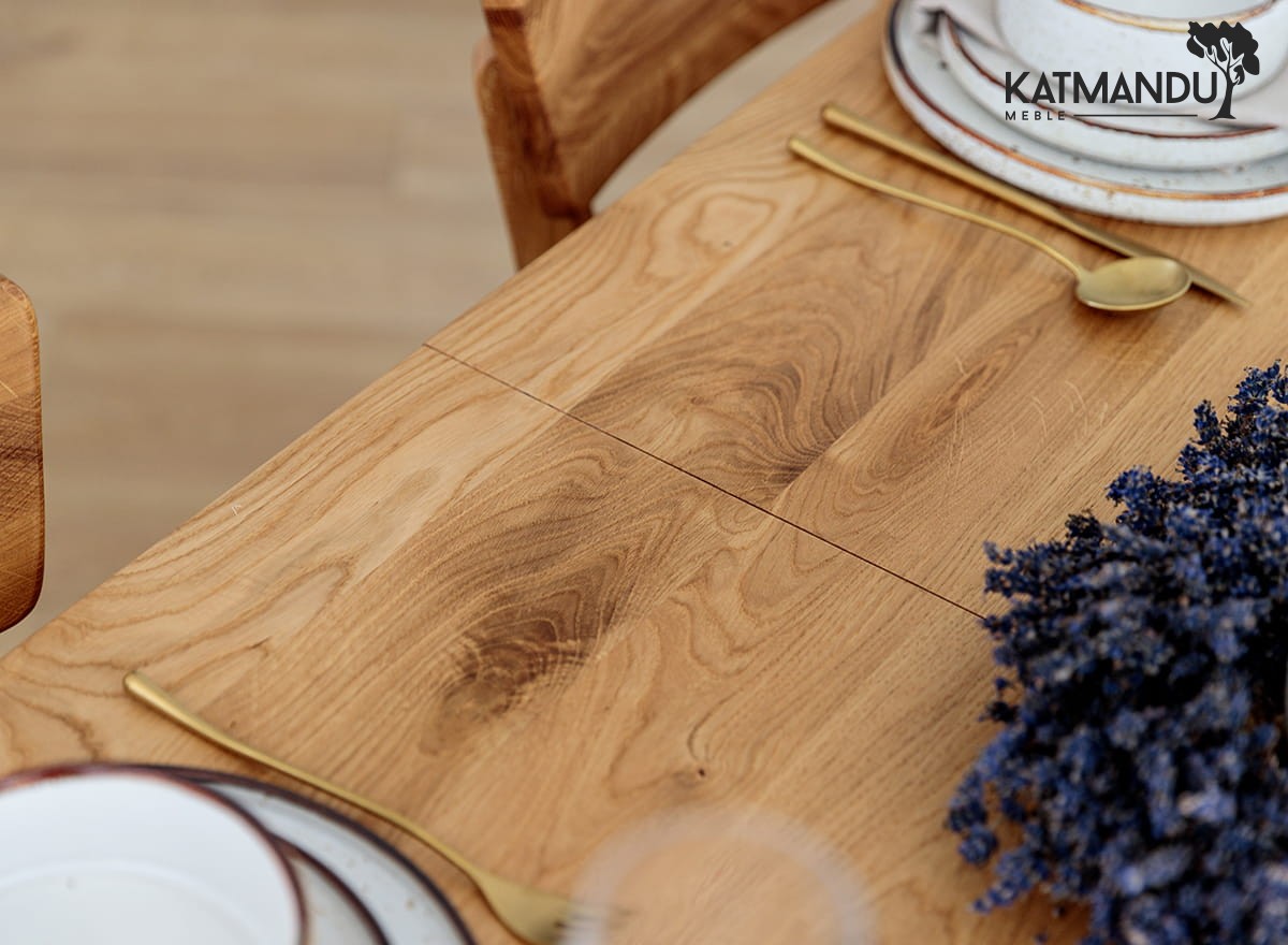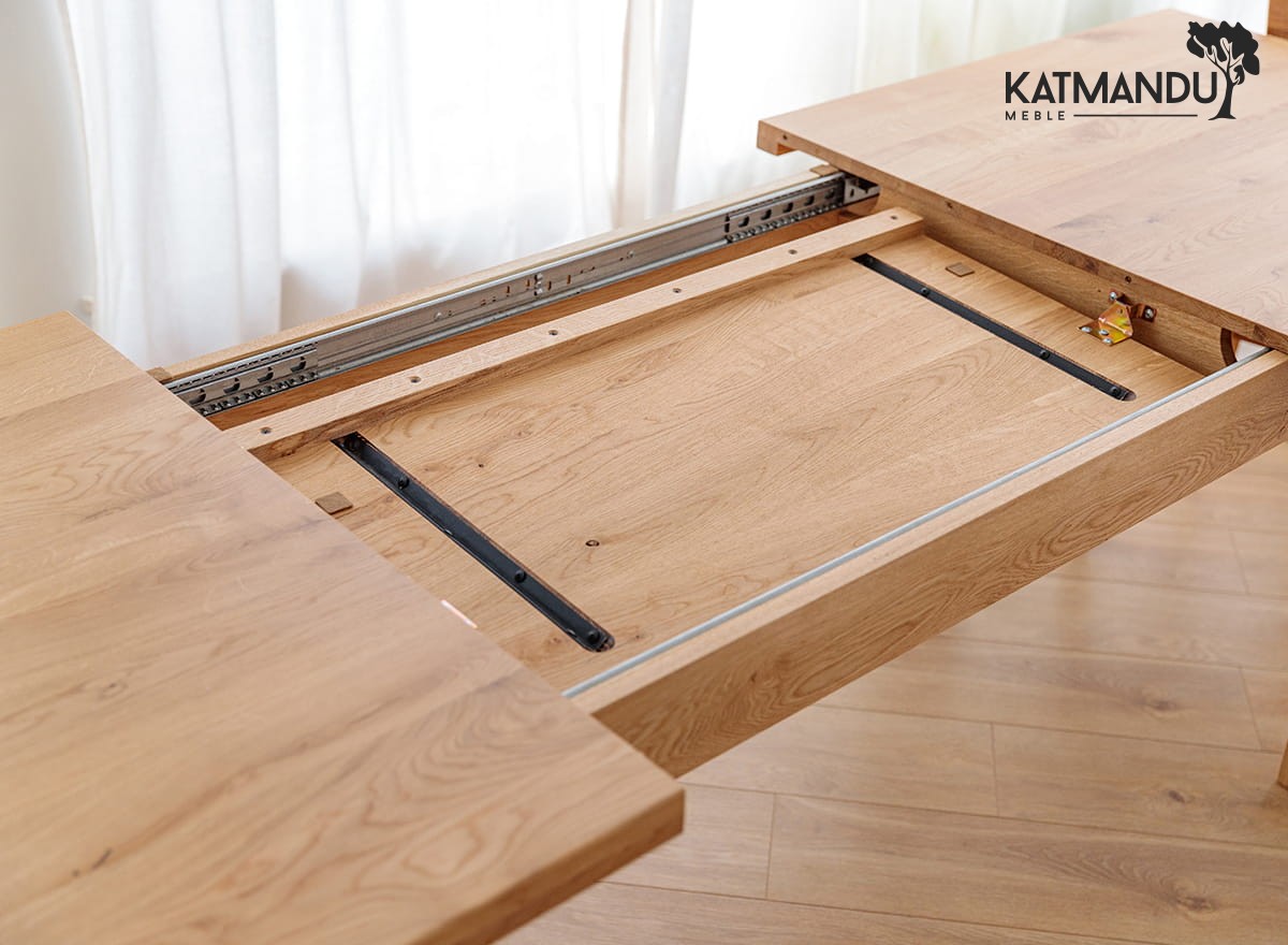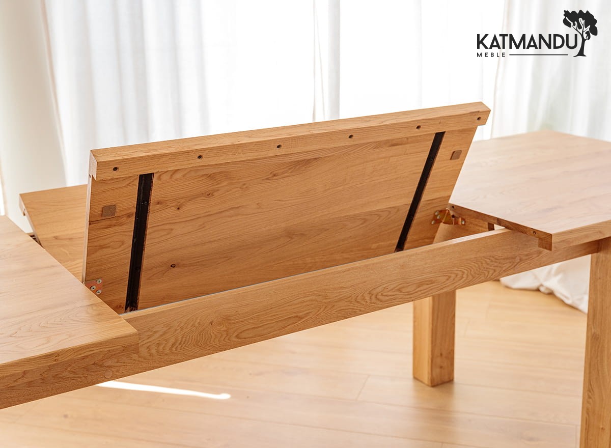 Die 2 cm starke Tischplatte betont die natürliche Maserung des Holzes, während die stabilen 10 × 10 cm starken Beine für einen sicheren Stand sorgen. Der Ausziehmechanismus ist leichtgängig und lässt sich mit minimalem Aufwand bedienen, sodass der Tisch im Handumdrehen vergrößert werden kann. Durch die geölte Oberfläche ist der Tisch widerstandsfähig gegenüber alltäglichen Gebrauchsspuren und behält seinen warmen Farbton über viele Jahre hinweg.