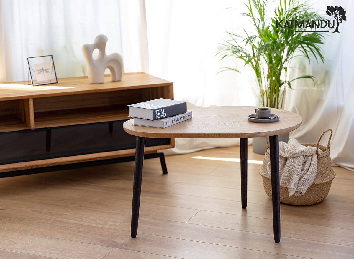 Die organisch abgerundete Tischplatte mit den Maßen 80 × 60 cm und einer Höhe von 31,3 cm schafft einen wohnlichen Mittelpunkt, der sich ideal für Getränke, Bücher oder dekorative Accessoires eignet. Drei schwarz lackierte Eichenholzbeine verleihen dem Tisch Stabilität und unterstreichen seinen modernen Loft-Charakter. Dank der widerstandsfähigen Ölbehandlung ist die Oberfläche geschützt, pflegeleicht und langlebig.