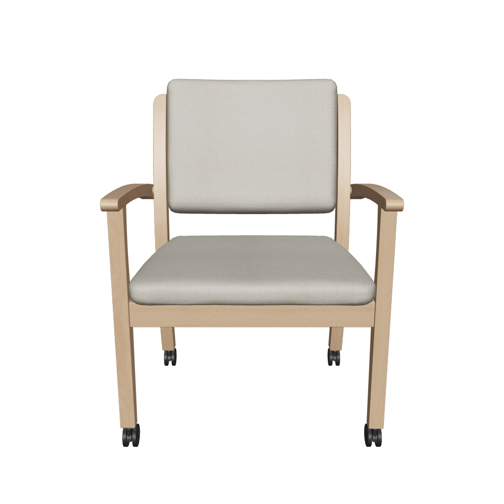 Dank der integrierten Premium-Rollen lässt sich der Stuhl besonders leicht und geräuscharm auf allen Böden bewegen. Zwei bremsbare Rollen an den hinteren Beinen sorgen jederzeit für einen sicheren Stand. Der Stuhl eignet sich somit ideal für flexible Pflegeeinsätze, bei denen Mobilität und Stabilität gleichermaßen gefragt sind.